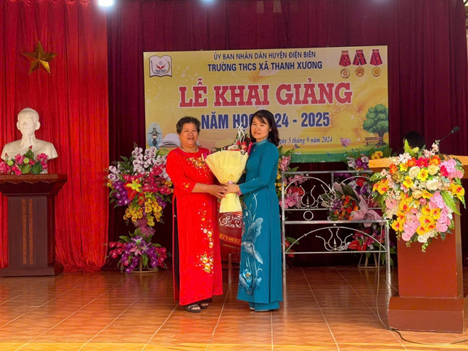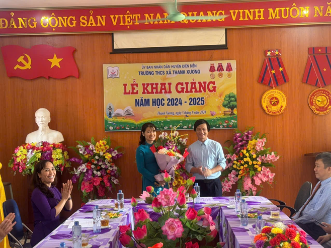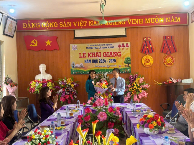 Hình ảnh lãnh đạo phòng GD&ĐT huyện Điện Biên tặng hoa, quà cho nhà trường.