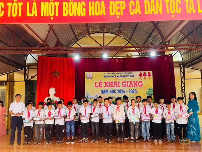 Đại diện lãnh đạo Ngân hàng Vietinbank Điện Biên tặng hoa, quà cho nhà trường.