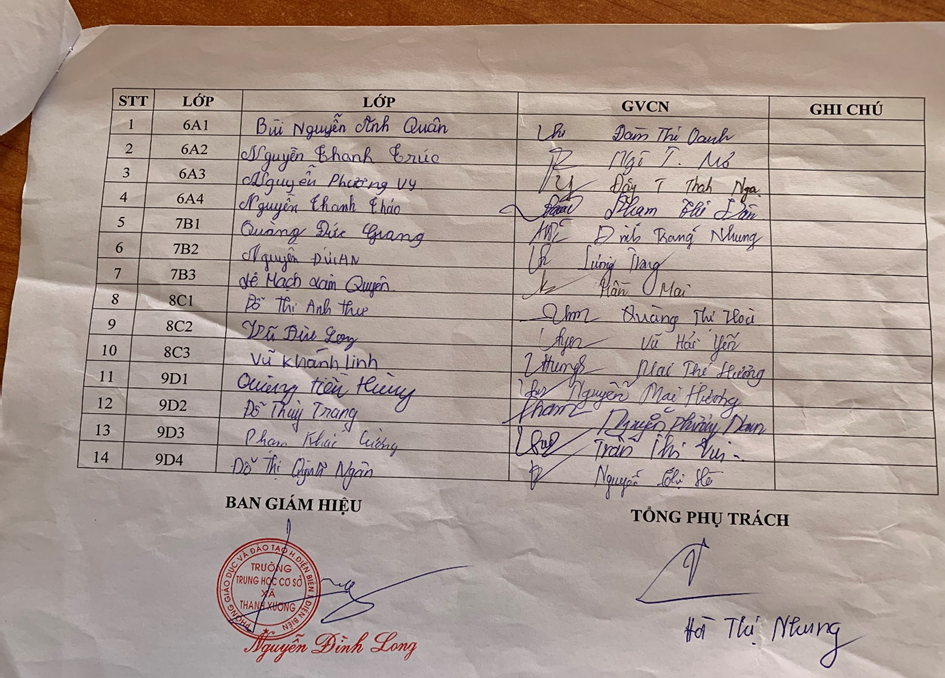 Danh sách lớp trưởng giáo viên chủ nhiệm các lớp ký cam kết thực hiện nội quy trường lớp: